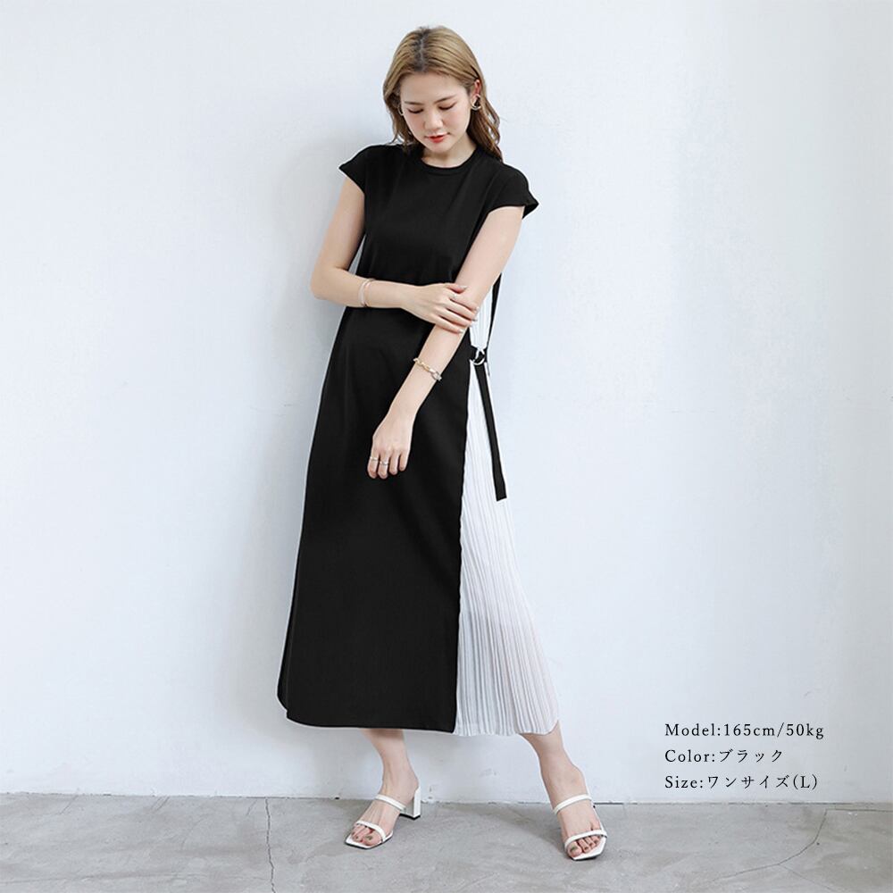 半袖ロングワンピース 配色ワンピ オフィス カジュアル 大人かわいい Aライン フレア シンプル 体型カバー 通勤