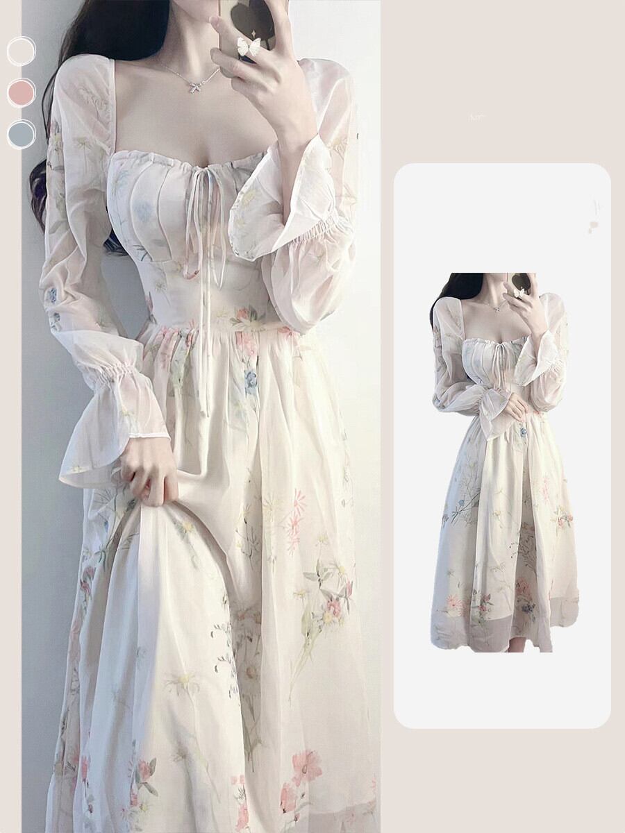 着痩せ シフォン ワンピース レディース ロングワンピース 長袖 キャンディースリーブ 花柄 フレアワンピ