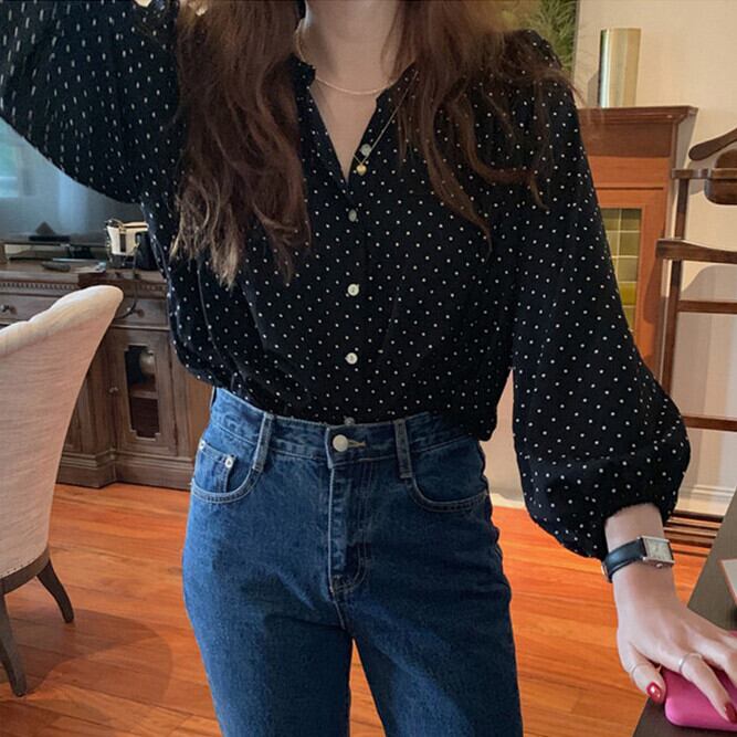 シャツ ブラウス 長袖ブラウス トップス レディース 人気シャツ ランタンスリープ ドット柄 気質 おしゃれ