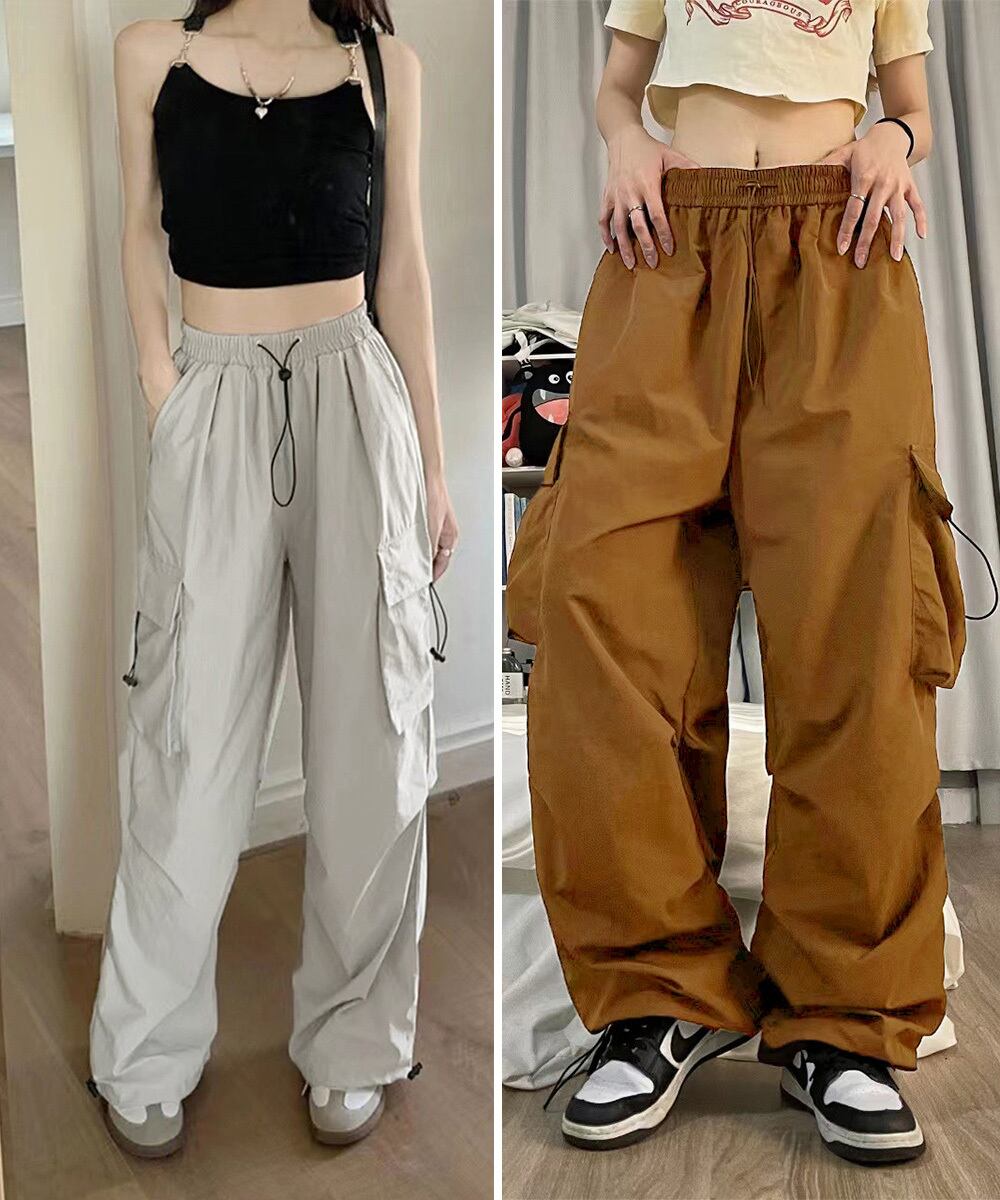 ミリタリーパンツ 薄手パラシュートパンツ 春夏スポーツパンツ ダンス衣装 韓国風 ウエストゴム ストリート ワイドパンツ