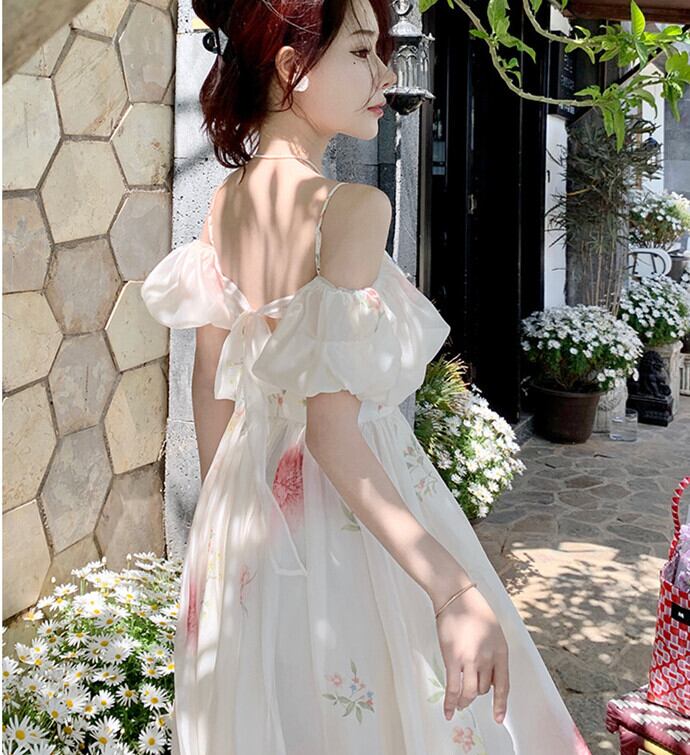 花柄ワンピース オフショルダー パフスリーブ キャミソールワンピース フレアワンピース ロングワンピ