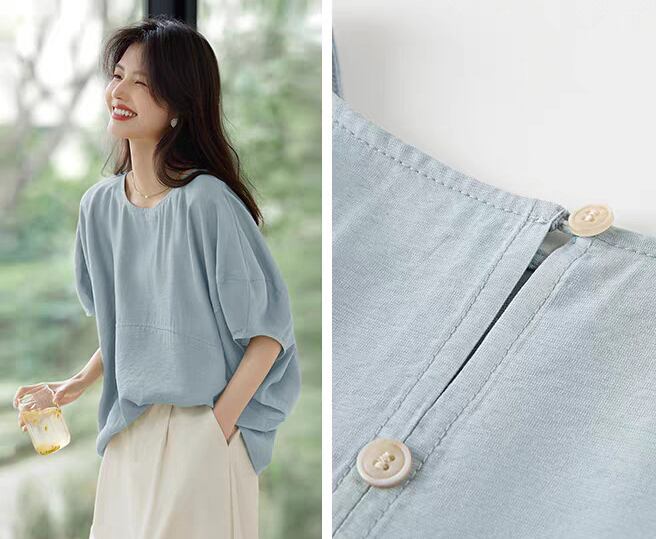シャツ レディース ブラウス トップス 綿 麻 チュニック おしゃれ リネンシャツ 七分袖 ノーカラー 薄手