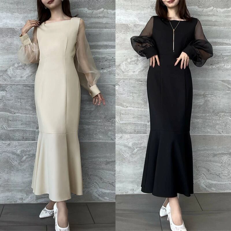 ワンピース レディース ロング丈ワンピース 長袖 ドレス 異素材 気質 きれいめ