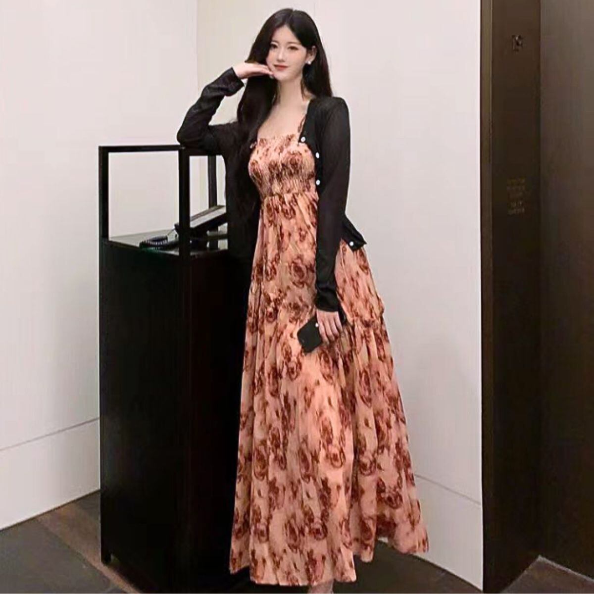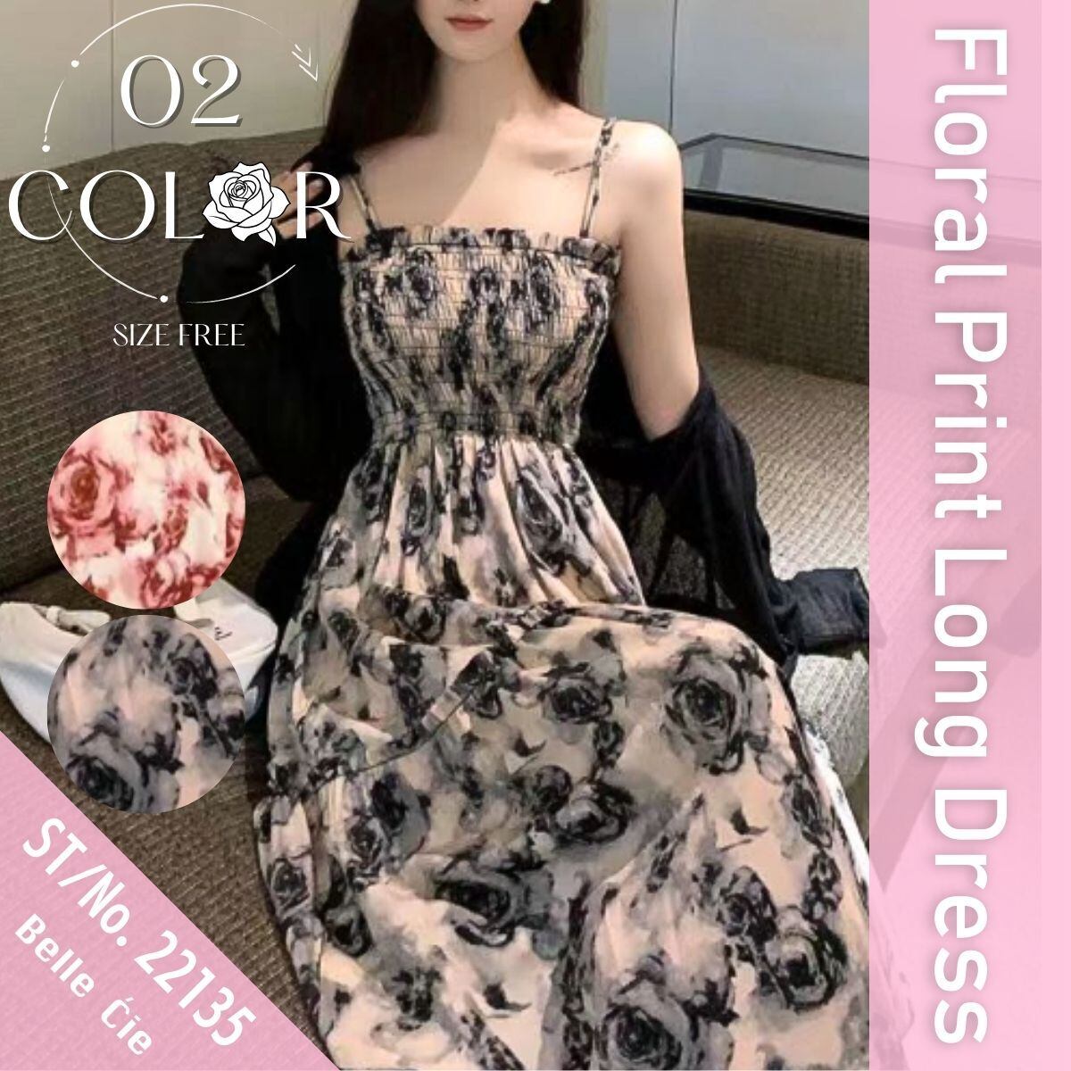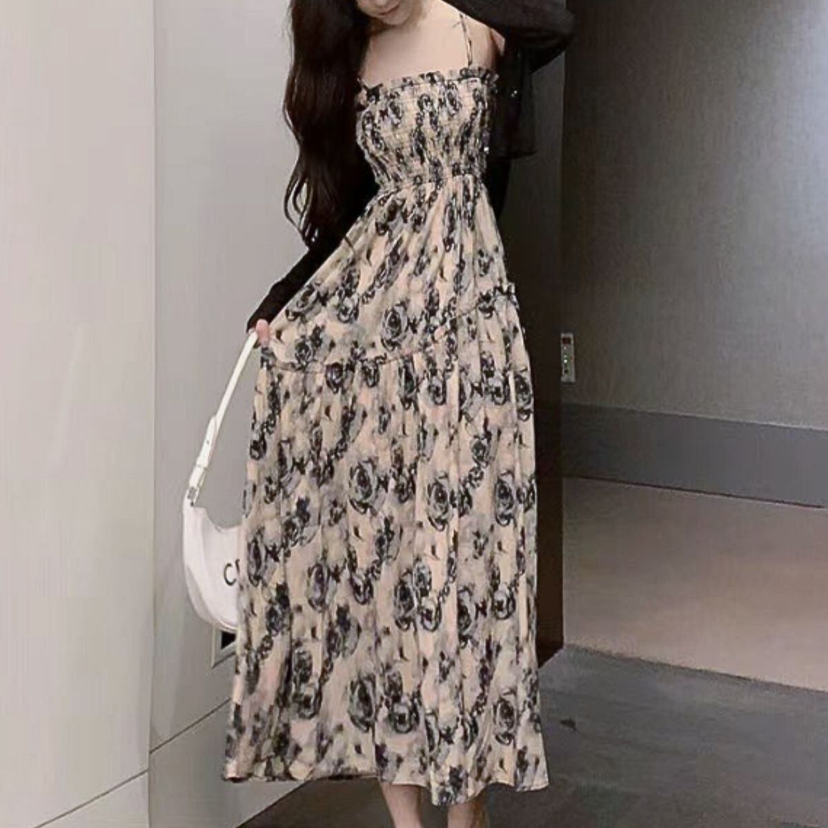 ワンピース レディース マキシ丈 ロングワンピース 花柄 レトロ キャミ紐 柄 キャミワンピ