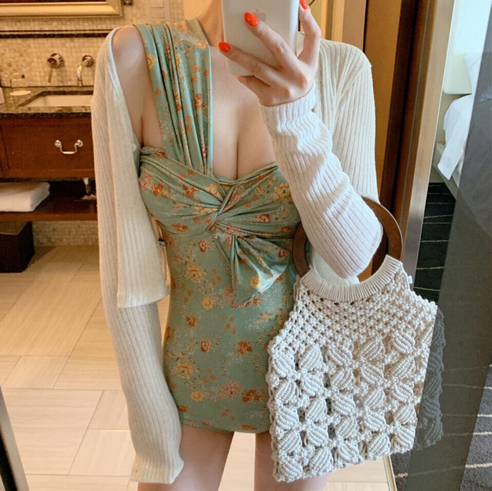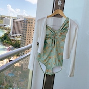 体型カバー水着 ワイヤーなしビキニ ビーチファッション ハワイアン リボン ハイウエスト パッド入り