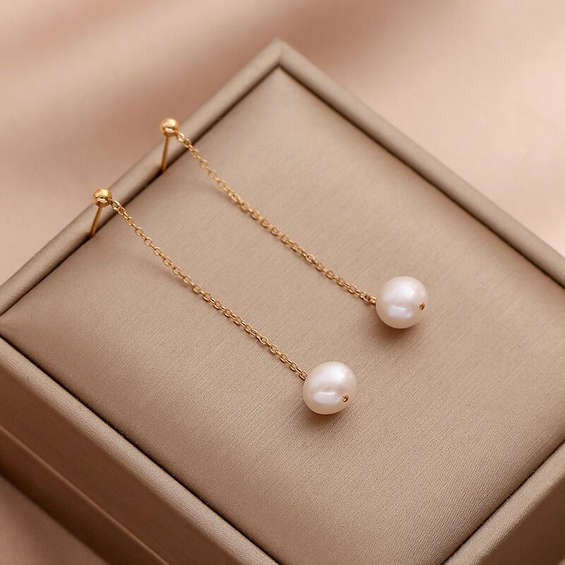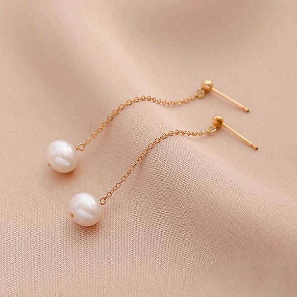 淡水パールをあしらった清楚なロングチェーンピアス。