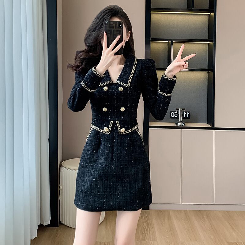 ツイード ワンピース ミニドレス パーティードレス 韓国ファッション ボタン パイピング 黒 ブラック 秋冬