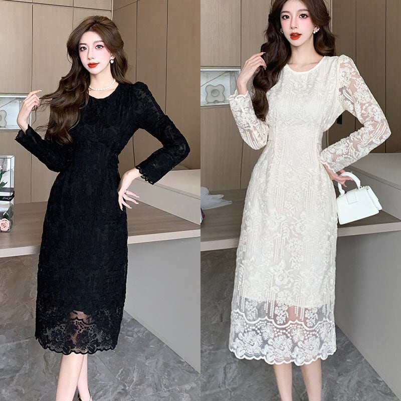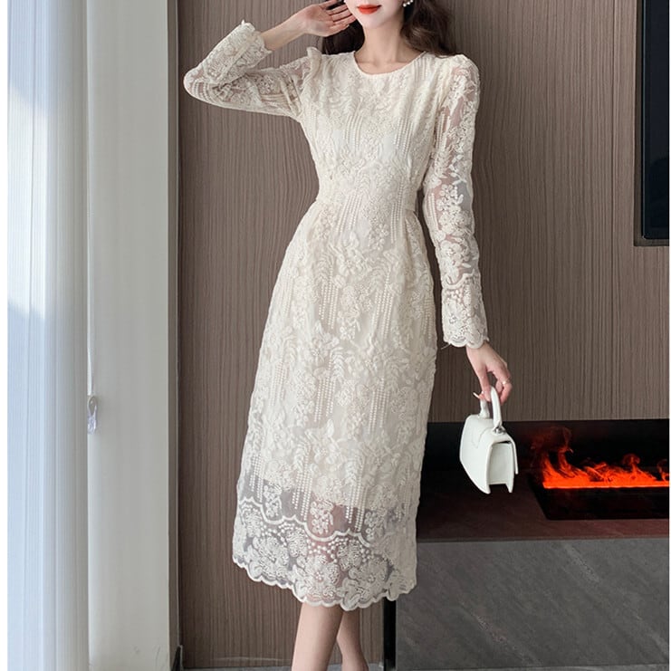 フラワー柄の総レースがエレガントなタイトシルエットのミモレ丈ワンピースドレス。
